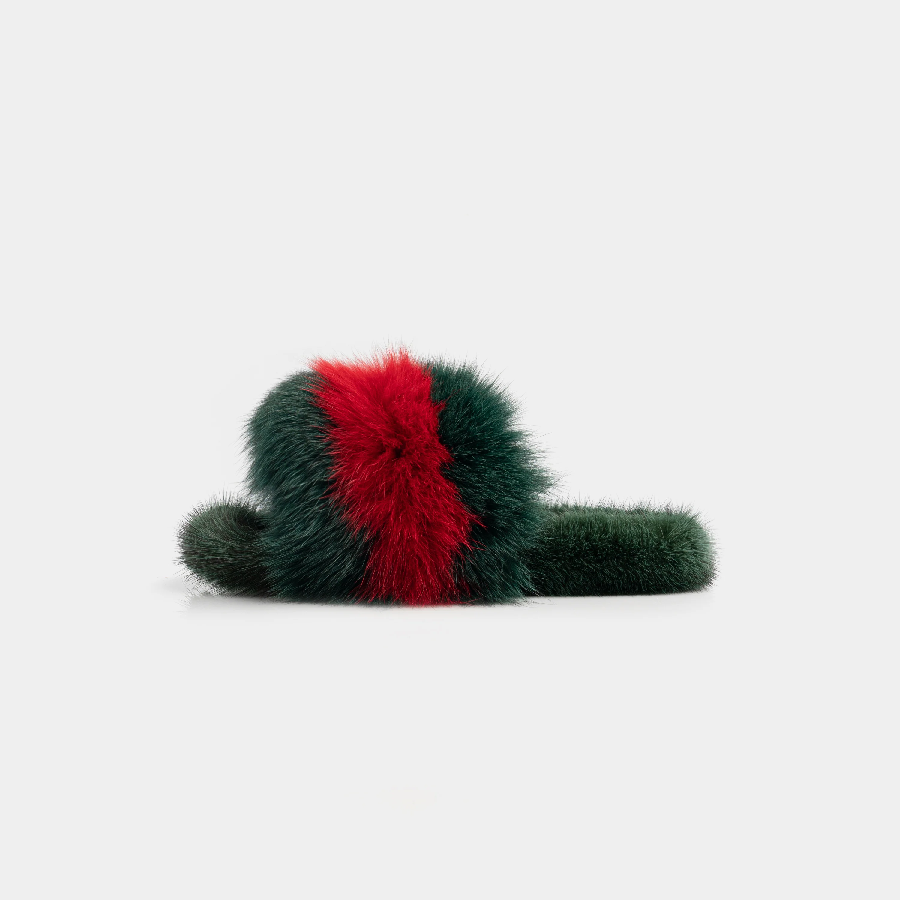 ASPEN - Slipper con fascia in volpe e bordatura in visone (Rosso/Verde)